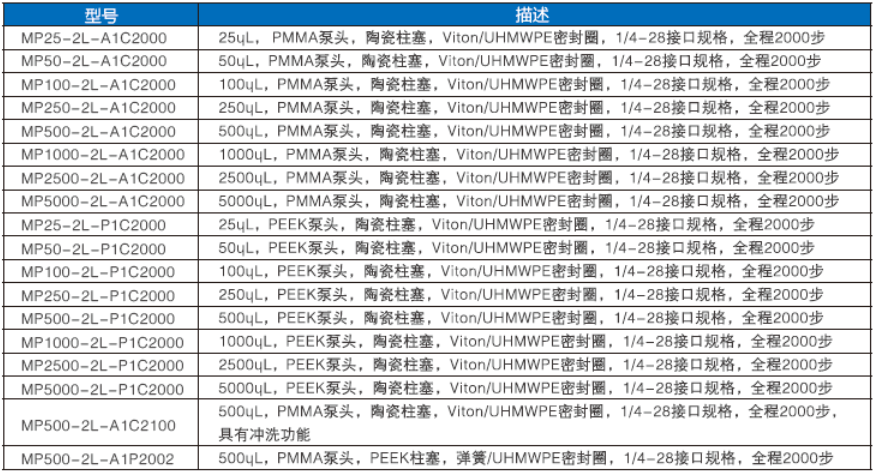 提供多種泵頭材質(zhì)(PMMA/PEEK/PEI及其它)、多種柱塞材質(zhì)(陶瓷/PEEK及其它),多種密封圈材質(zhì)(UHMWPE/Viton/FFKM/302ss及其它)。針對(duì)不同屬性的溶液選擇適合的材質(zhì),可延長(zhǎng)泵的使用壽命,降低設(shè)備維護(hù)成本。